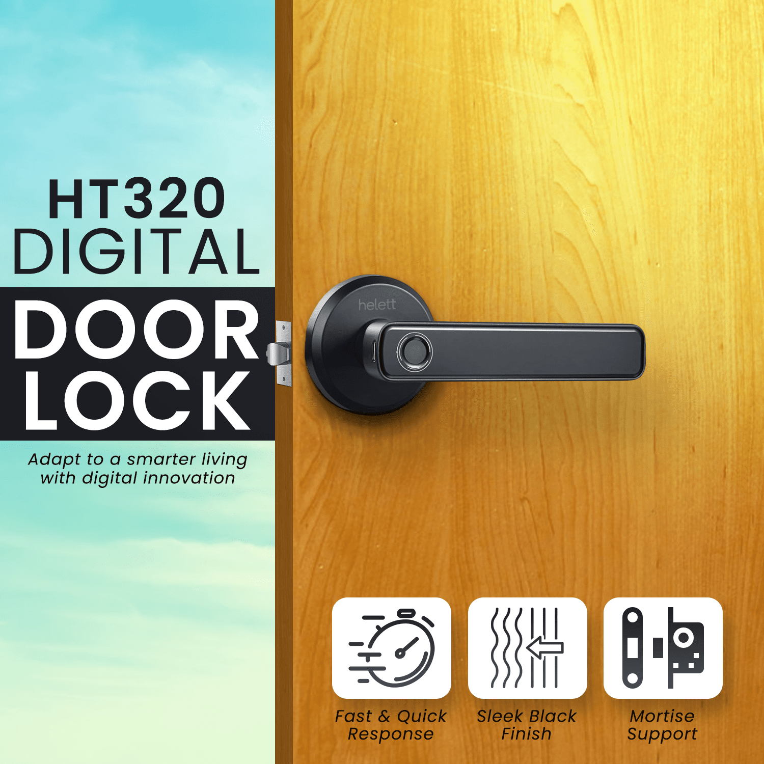 Helett HT320 Digital Door Lock is a smart, stylish, and secure access solution crafted for modern homes, office cabins, and bedrooms. Designed with a focus on ease of use and robust protection, it combines biometric technology with traditional and emergency access methods, making it ideal for both residential and light commercial environments. This digital lock supports up to 50 fingerprints, allowing multiple family members or authorized users to access the door with a simple touch. The advanced fingerprint recognition system ensures quick and reliable unlocking, reducing the need for keys or remembering passcodes. For added convenience and safety, the HT320 is also equipped with a manual key override. This traditional backup method allows you to unlock the door in case the fingerprint sensor is unavailable. Additionally, the lock features a USB emergency unlock option—an essential feature in the event of power or battery failure. By connecting a power bank via USB, users can temporarily power the lock and access the door without worry. The lock supports mortise installation, which enhances overall door security by embedding the lock body into the door itself. Its lightweight yet durable construction makes it easy to install while offering long-lasting performance. Designed to fit 30mm to 55mm thick aluminum or wooden doors, it is compatible with both left- and right-hand door orientations, ensuring flexibility for various setups. Finished in an elegant black design, the Helett HT320 blends seamlessly with contemporary interiors, adding a modern touch to your space. Whether you’re upgrading your home security or improving access control in a workspace, the HT320 provides a reliable, smart, and sleek locking solution. In short, the Helett HT320 brings together security, convenience, and style—perfect for anyone seeking a hassle-free digital lock for daily use.